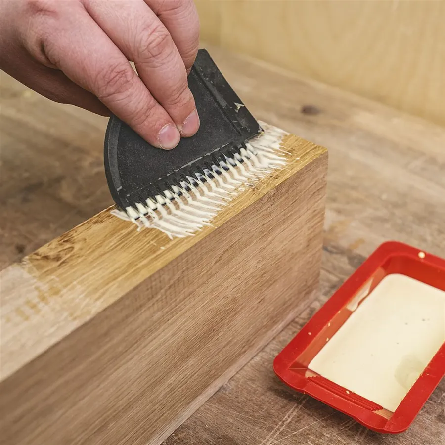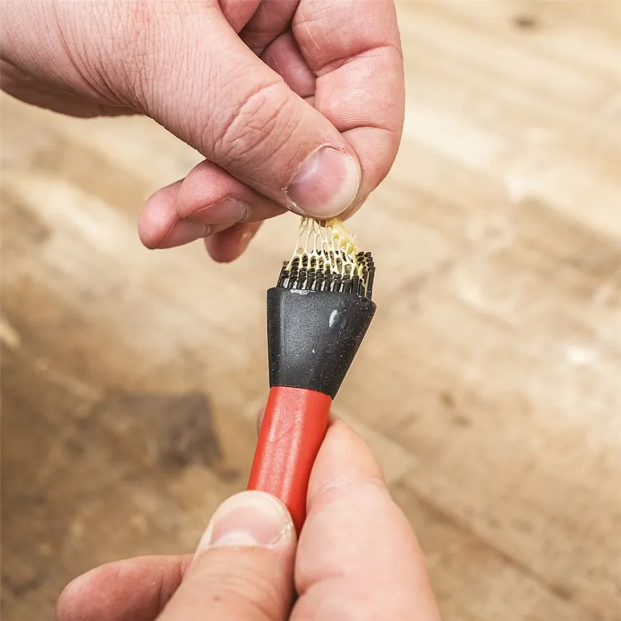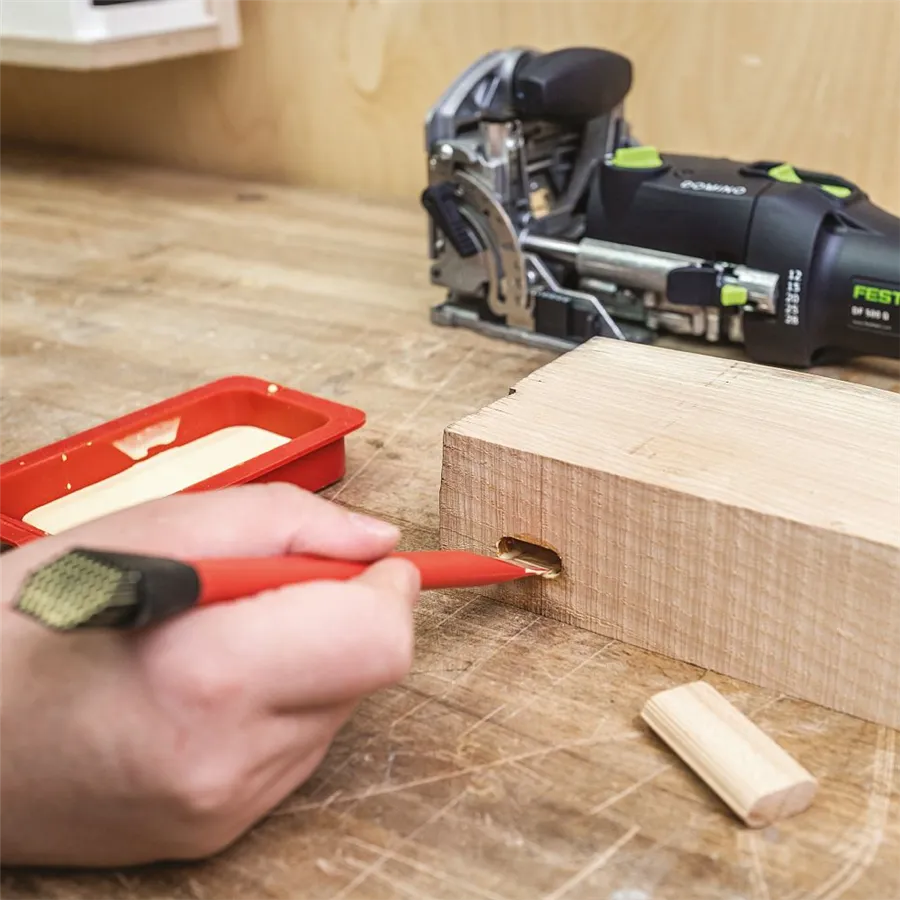 Silikonpinsel zum bequemen Auftragen von Kleber auf Holz. Zwei Pinselgrößen inklusive Silikonabstreifer und Schale für den universellen Gebrauch. Leicht zu reinigen.