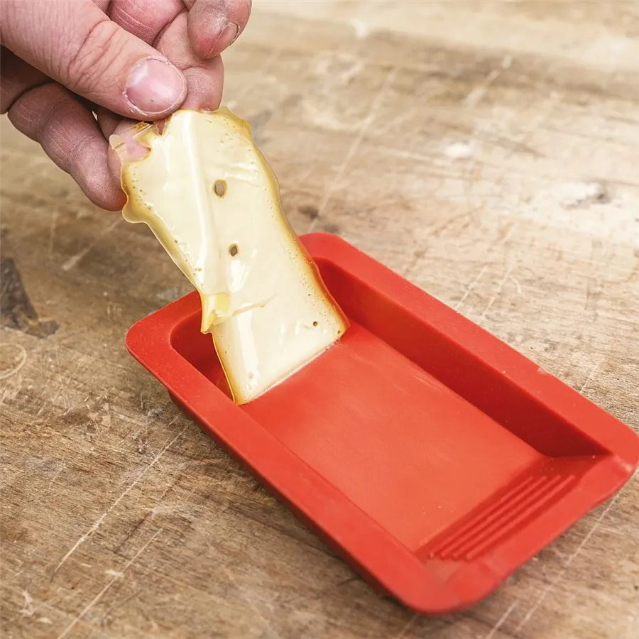 Abstreifer, Schale und Pinselaufsätze sind aus Silikon hergestellt, der eine einfache Reinigung garantiert. Nach Beendigung der Arbeit gießen Sie den überschüssigen Kleber mithilfe der Vertiefungen an der Seite der Schale zurück in den Behälter. Sie können diese Vertiefungen auch als Pinselablage nutzen, damit Sie während der Arbeit die Arbeitsfläche nicht verschmutzen. Lassen Sie Kleberreste auf den Pinseln und in der Schale trocknen und schälen Sie sie dann einfach ab, oder waschen Sie alles sofort nach der Arbeit unter lauwarmem Wasser ab.